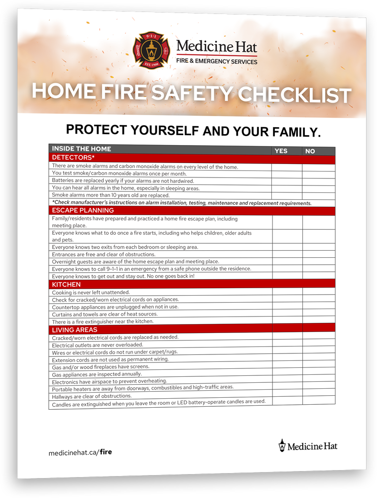 We can test your smoke alarms, discuss your fire escape plan, and help you look for hazards that may exist in your home. To coordinate a free home and life safety inspection, email kelire@medicinehat.ca